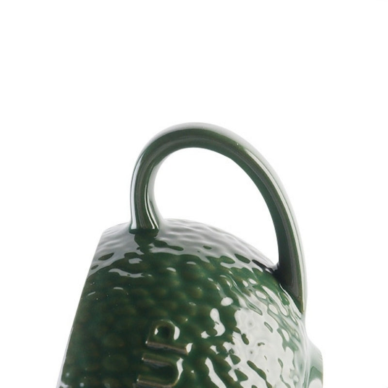 The Avocado Cute Milk Coffee Ceramic Cup Three-Piece Set includes a charming green ceramic cup with a unique hammered texture and an engraved "AVOCADO CUP" inscription. It comes with a matching green spoon featuring a light green interior and a lid topped with a brown avocado-like knob. The set is perfect for enjoying hot beverages or soups, combining whimsical design with practical functionality in a delightful avocado theme.