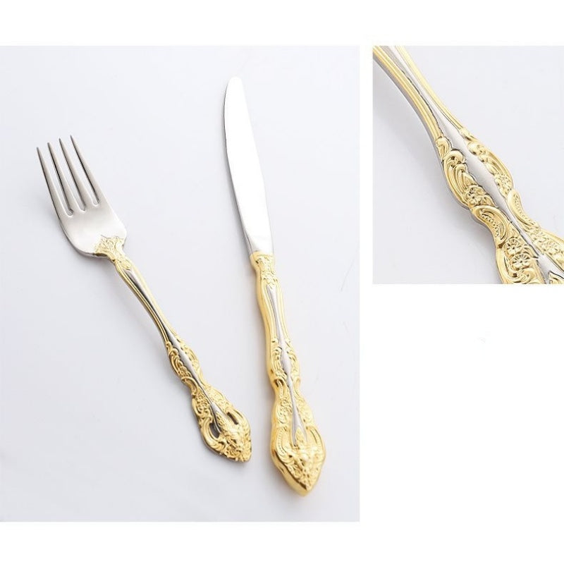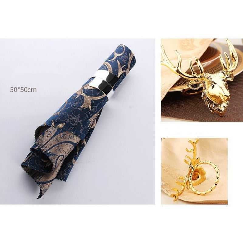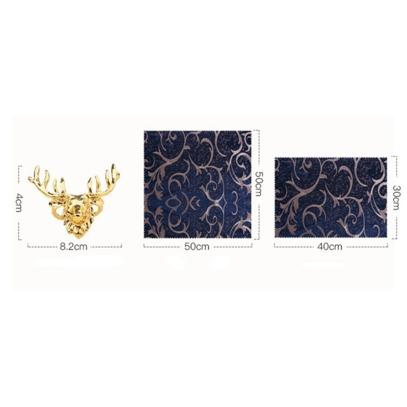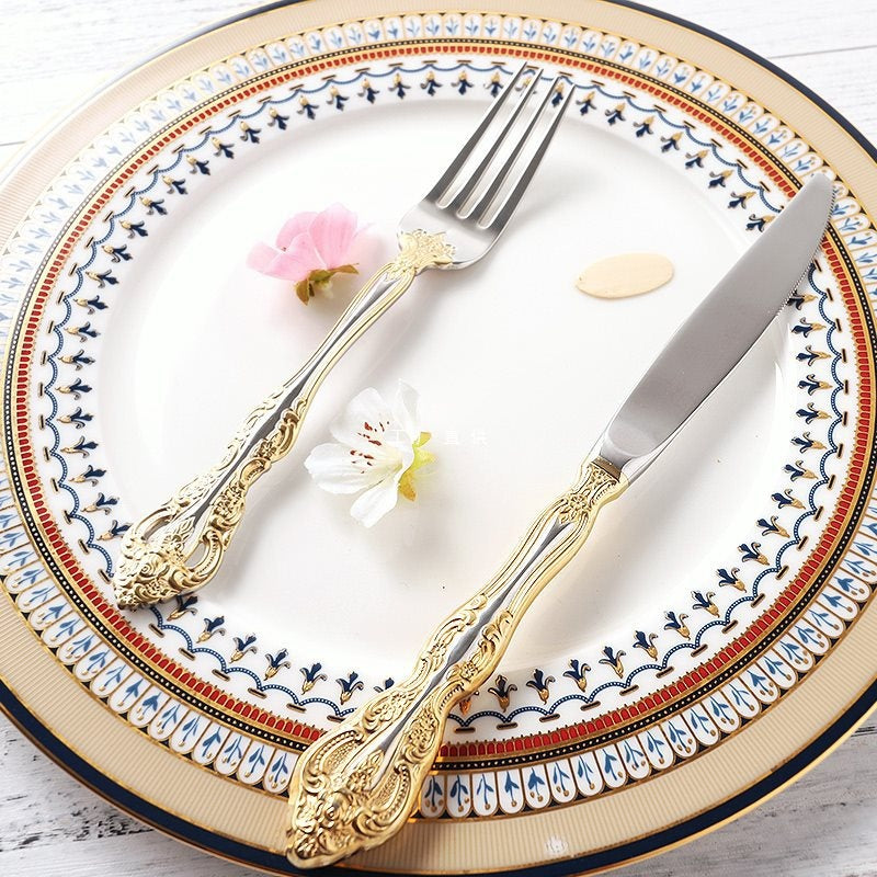 This European-style bone china tableware set features elegant steak plates, dinner plates, soup bowls, and bone plates crafted from premium bone china for a lightweight yet durable build with a translucent finish. Adorned with intricate blue-and-gold patterns and gilded rims, the pieces exude luxury. The set includes ornate gold-plated stainless steel cutlery with detailed handles, matching blue-gold placemats, and a golden deer head ornament for added sophistication. High-temperature firing ensures stain resistance and easy maintenance, perfect for formal dinners or upscale gatherings.