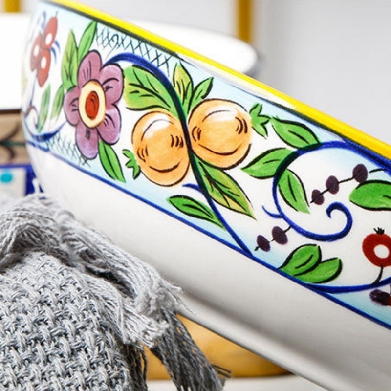 This set of creative ceramic soup plates features hand-painted designs in vibrant colors, adding a touch of artistry to any meal. Each 8-inch deep plate is crafted from high-quality ceramic, ensuring durability and a smooth finish. The round, versatile design makes them perfect for soups, salads, or vegetable dishes. With a weight of 0.5-0.55kg, these plates are sturdy yet easy to handle. The intricate patterns, including floral and nature-inspired motifs, bring elegance to everyday dining.