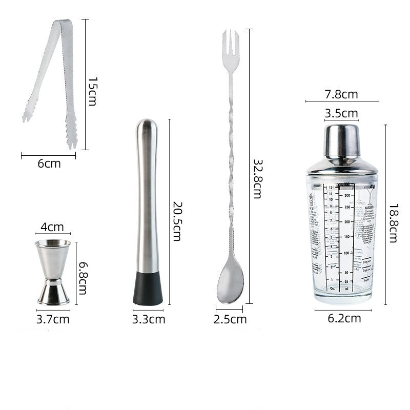 This glass cocktail shaker features a built-in marked measuring cup for precise ingredient mixing, crafted from durable, high-quality glass and stainless steel. The shaker includes a tight-sealing lid to prevent leaks and a strainer for smooth pouring. With clear measurement markings, it ensures accuracy for any cocktail recipe. The set is completed with essential bar tools, making it perfect for both amateur and professional mixologists.