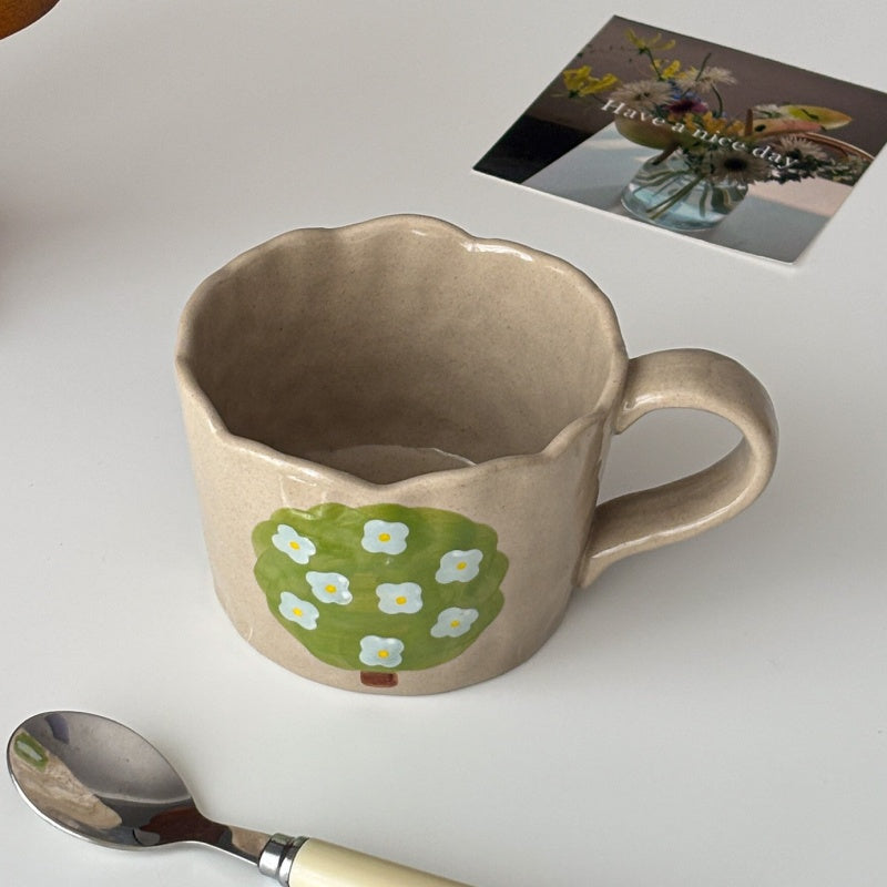 Introducing the Hand-Painted Rough Clay Irregular Hand-Shaped Mug, a unique and artistic addition to any drinkware collection. Crafted from rough clay, this mug features an irregular, hand-shaped design that adds a rustic charm. Each piece is hand-painted with delicate motifs of fruit trees, showcasing vibrant colors and intricate details. The mug's organic form and artisanal finish provide a comfortable grip and a distinctive aesthetic. Perfect for enjoying your favorite beverages with a touch of handmade elegance.