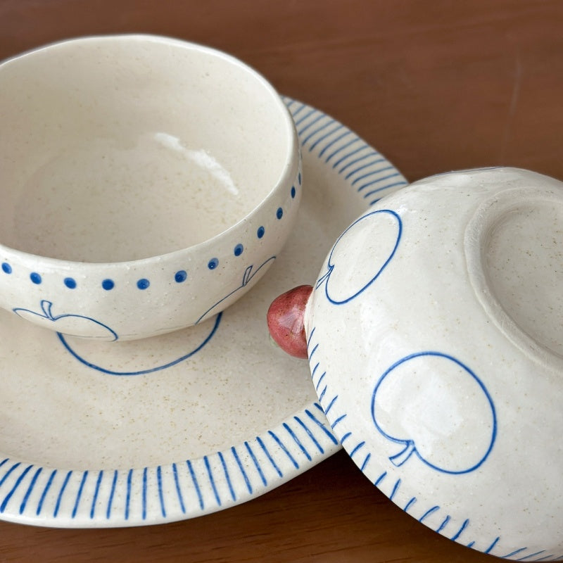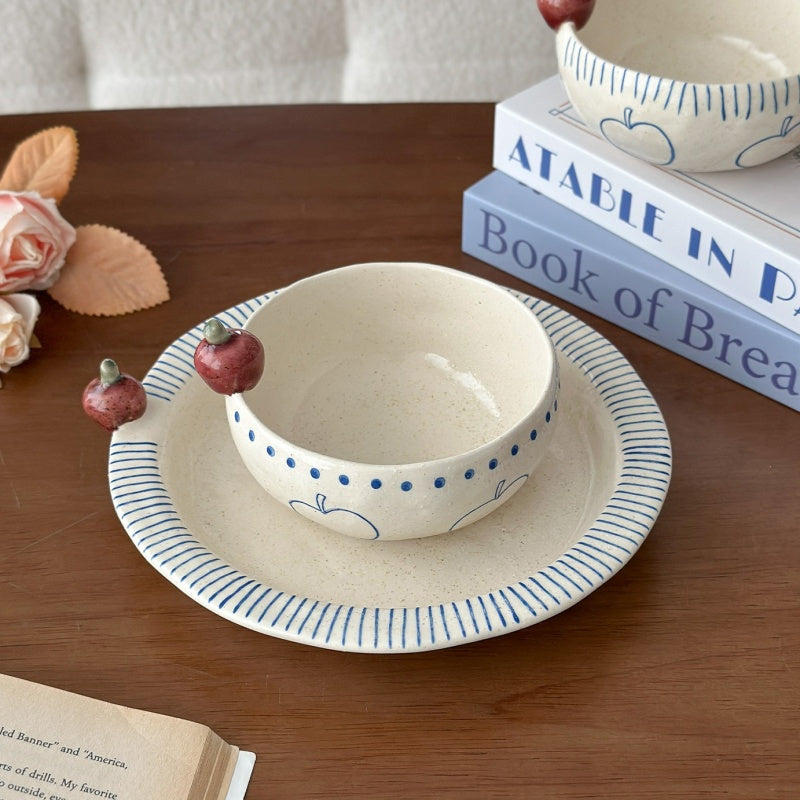 This rustic pottery tableware set features charming hand-painted small apple-shaped designs on both bowls and plates, adding a touch of whimsy to any meal. Crafted from durable stoneware, each piece showcases a unique, artisanal finish with delicate blue patterns. The bowls are perfectly sized for soups or desserts, while the plates provide an ideal surface for appetizers or snacks. A delightful blend of functionality and handcrafted beauty.