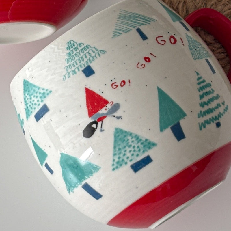Discover the festive charm of our Hand-Painted Style Red Handle Christmas Ceramic Mug. This delightful mug features a white base adorned with hand-painted green pine trees and a cheerful red-capped figure. The word "GO!" is playfully inscribed, adding to its holiday spirit. With a vibrant red handle and a matching red base, this mug combines comfort and seasonal joy. The speckled interior enhances its rustic appeal, making it perfect for enjoying warm beverages during the festive season.