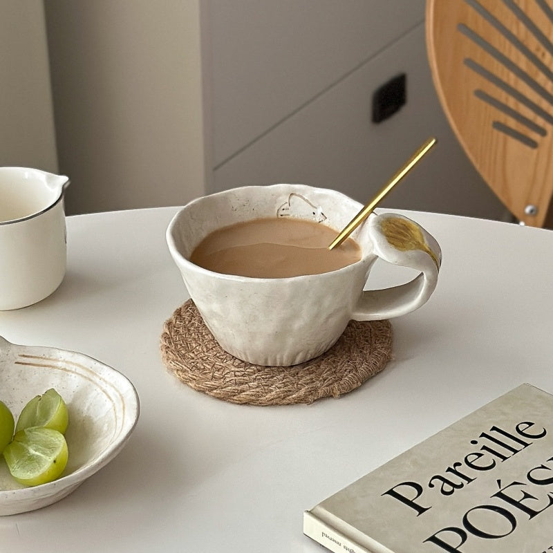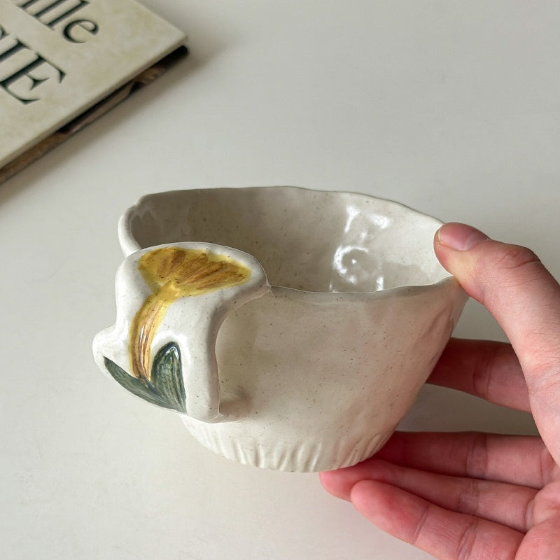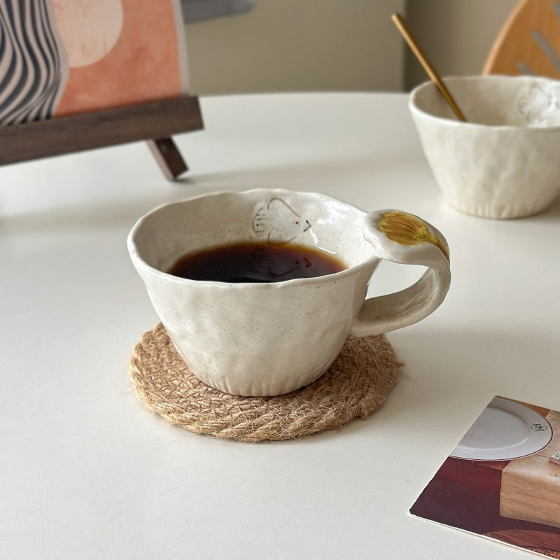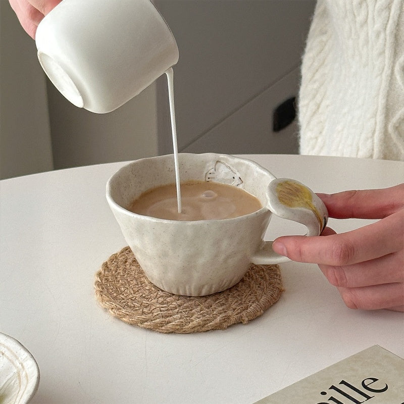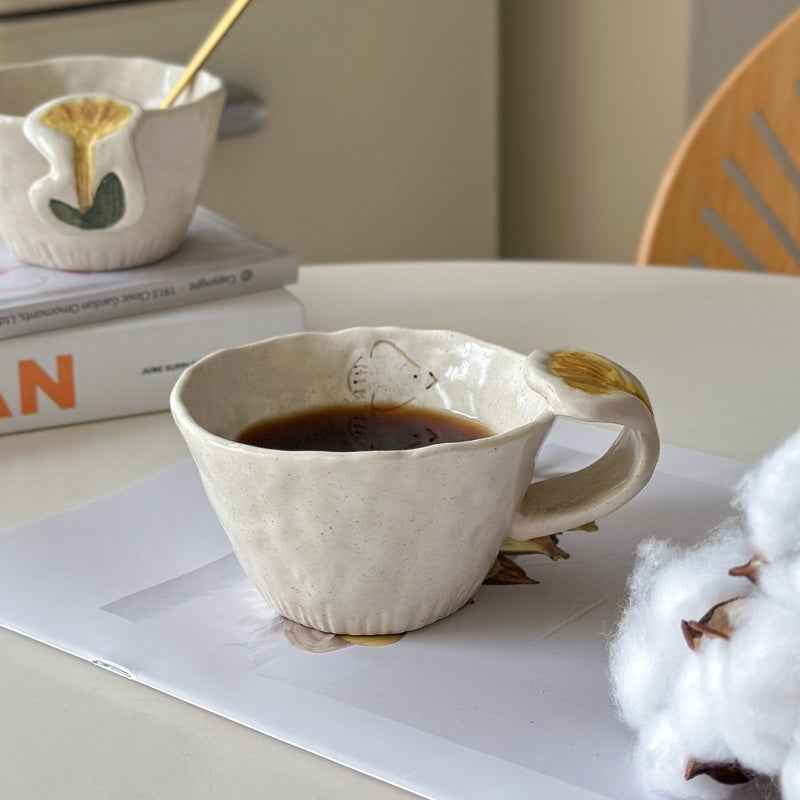 This retro mug features exquisite hand-painted flower and bird motifs under the glaze, adding an artistic touch to your daily coffee or tea ritual. The mug is crafted from high-quality ceramic and has a uniquely hand-pulled shape with a textured exterior. Its generous handle ensures a comfortable grip, while the subtle, speckled finish enhances its vintage charm. A perfect blend of functionality and aesthetic appeal.